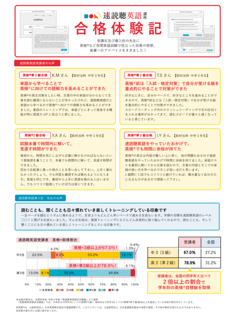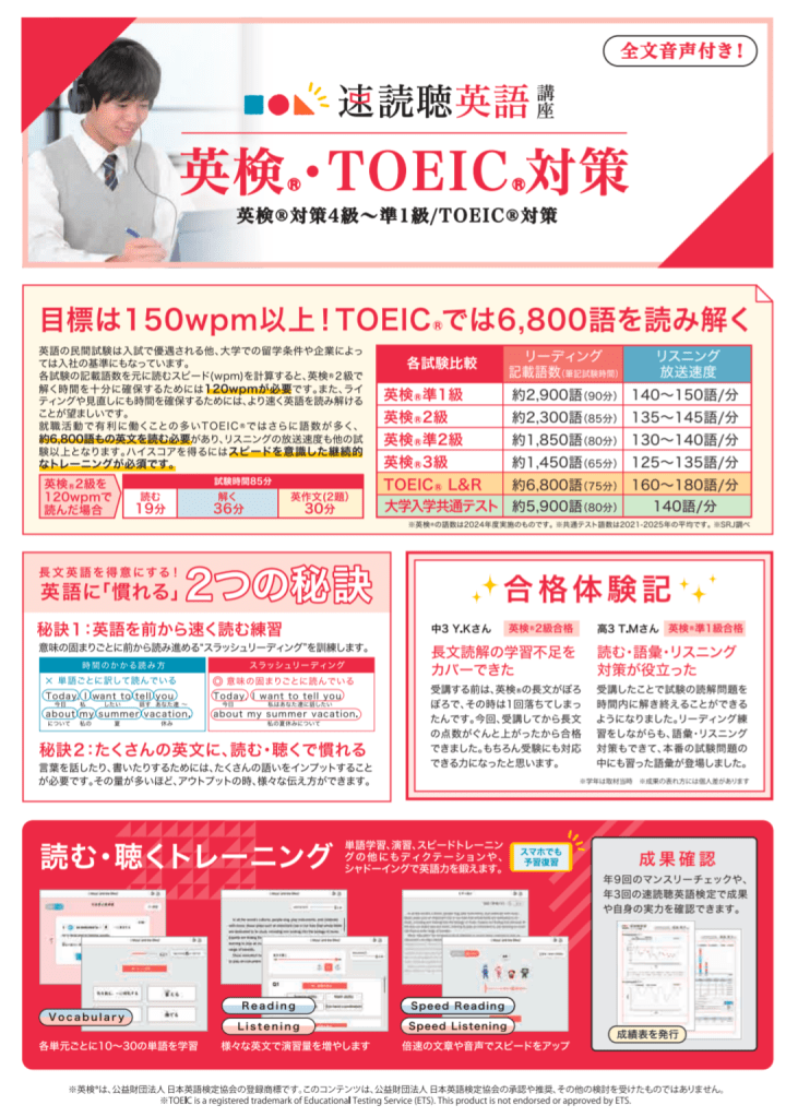 TERRACE速読聴英語は、速読の技術とリスニングのトレーニングを組み合わせることで、効率的に英語のリーディングとリスニングの能力を向上させることを目指した学習プログラムです。英検対策として活用する上でのポイントを以下にまとめます。