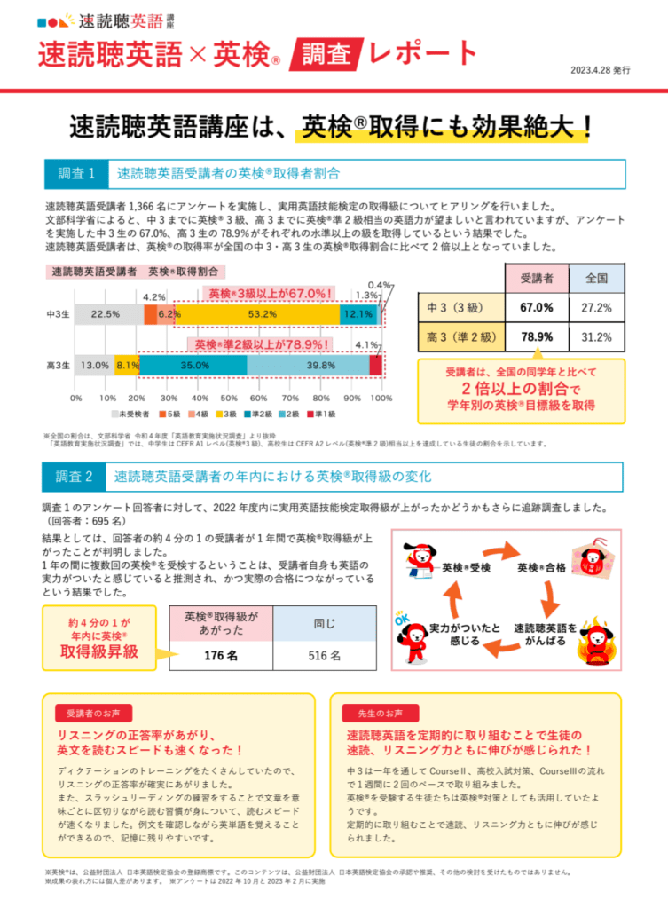 - 英文を読むスピードの向上: 意味のまとまりごとに英文を認識するスラッシュリーディングなどの速読トレーニングを通じて、限られた時間内でより多くの情報を処理する能力を高めます。英検の長文読解問題では、時間配分が重要となるため、速読スキルは非常に有効です。