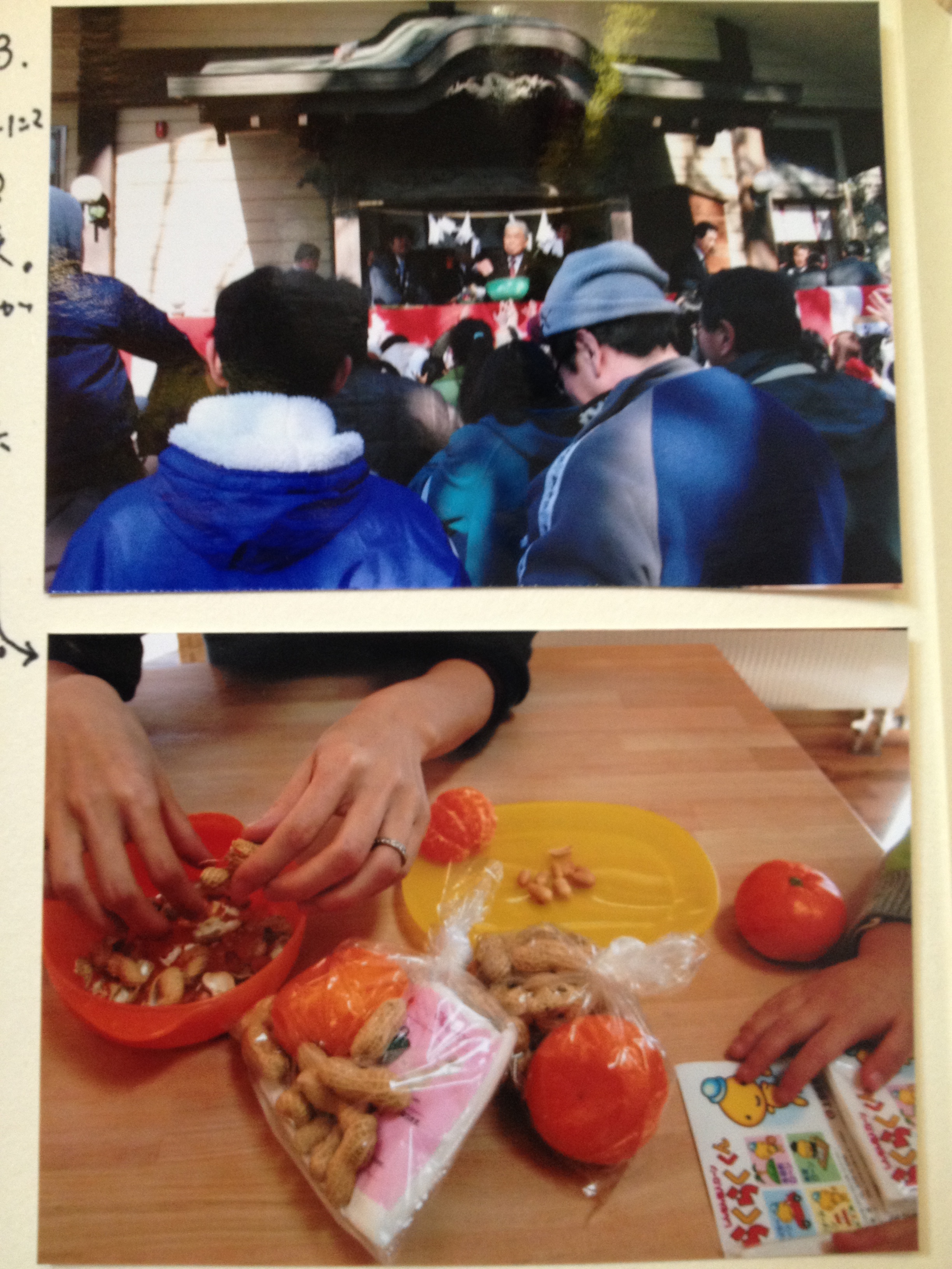 近所の長倉神社で、節分の豆まきがあるというので、当時、まだ三男がおらず、長男2歳、次男0歳を連れて、(なぜか夫も家にいたな・・・。仕事、サボってたんだっけ?)家族全員で、長倉神社へ行きました。